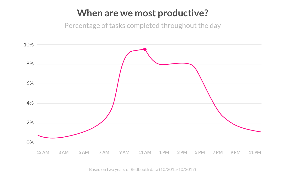 But take note: While the majority of us are most productive between 9 and 11 am, this isn’t the case for everyone. Everyone’s brains and bodies are different.
